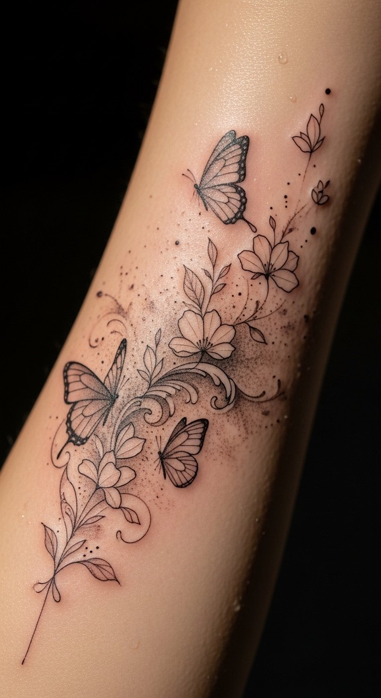 The design symbolizes gentle transformation and renewal: butterflies and flowers represent metamorphosis and softened beauty, while the ornamental elements fading into skin suggest harmony between art and self.