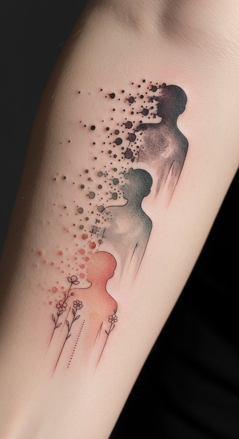 The dotwork and watercolor washes convey softness and healing; negative space honors the skin’s natural texture and acceptance. Emotionally it evokes calm resilience and liberation.