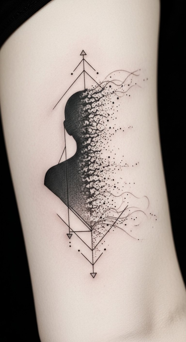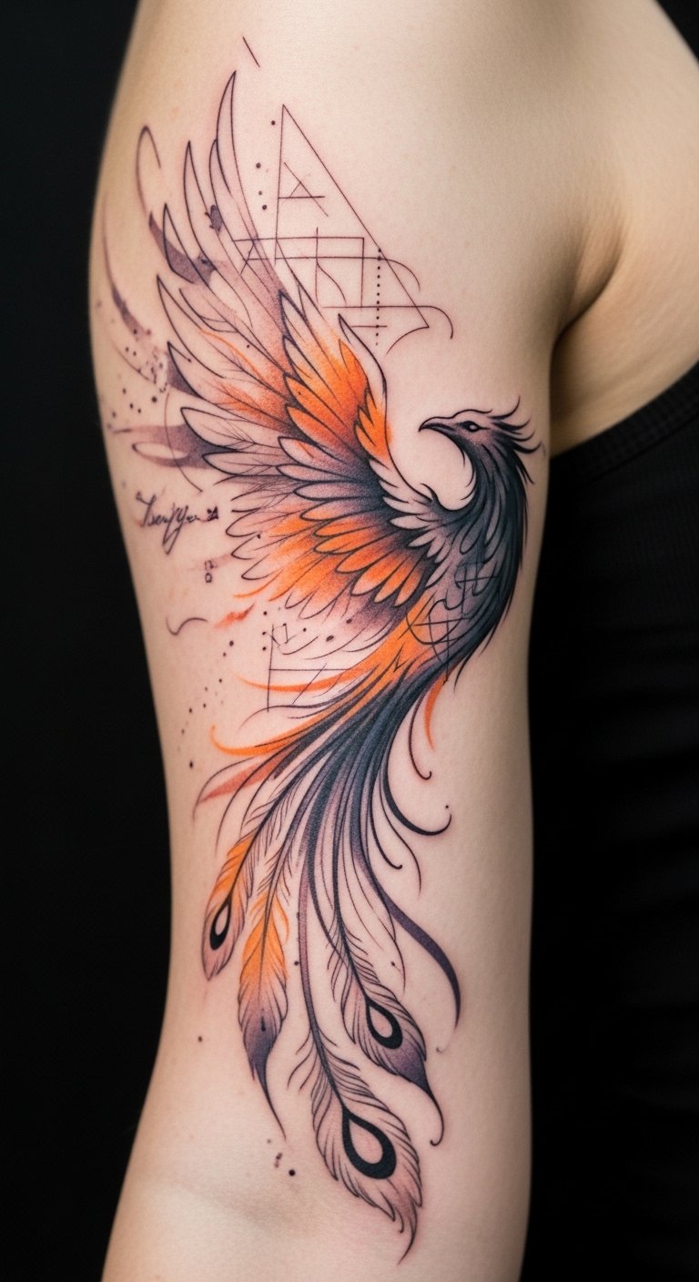 Tattoo fades represent transformation and renewal, capturing the emotion of letting go while honoring past identity; placed along the outer forearm so the dissolving phoenix follows the arm’s natural flow, the softened colors and geometric particles evoke calm resilience and a subtle boost to personal presentation, suggesting renewed confidence and openness to new opportunities while maintaining a graceful, healing aesthetic.