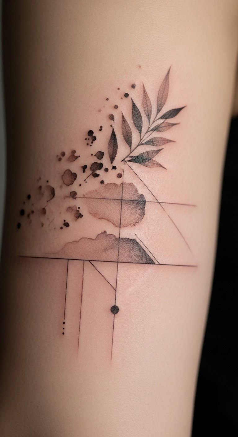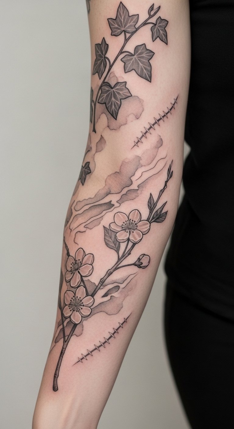 A design concept inspired by the language of careful transformation: a delicate sleeve blending from bold, original motifs at the shoulder into softened, stippled and watercolor-like pigments toward the forearm, with fine-line diagrams of consultation tools and botanical elements weaving through—symbolizing the tailored process and respect for skin integrity. The imagery evokes calm reassurance and agency, reflecting a client’s active role in choosing how their story fades; ideal placement is the outer arm or upper back where progression can be displayed and easily revisited during follow-up sessions.