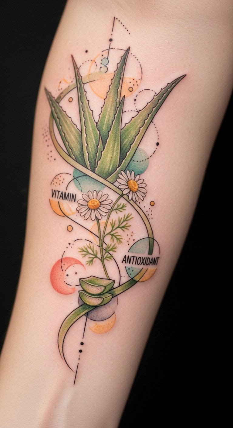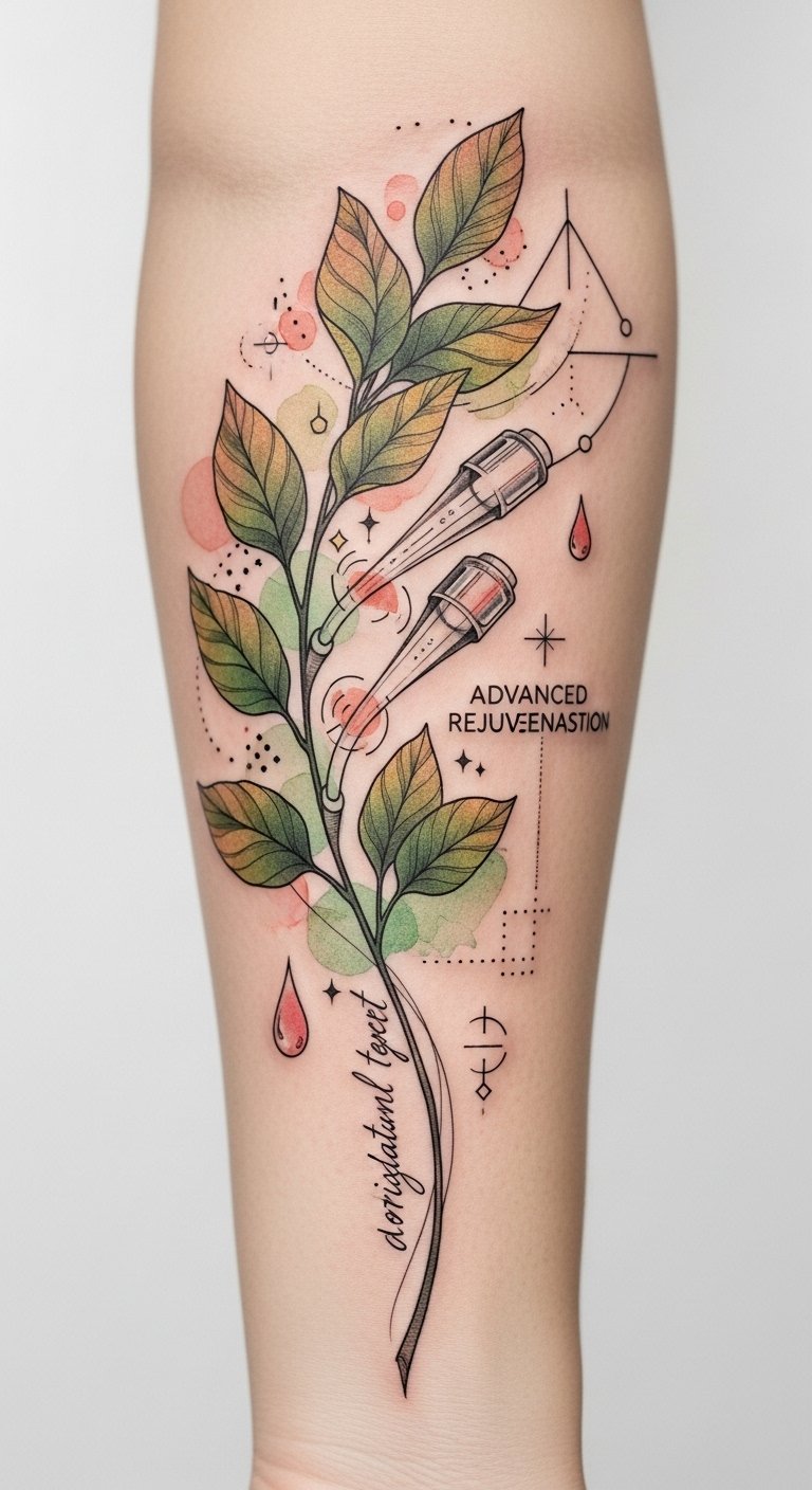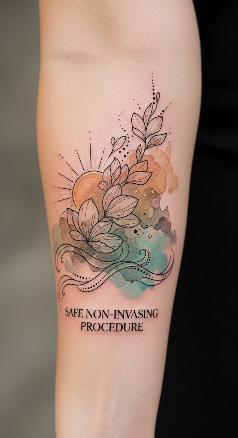 A flowing forearm tattoo blending a delicate watercolor wash with fine-line botanical elements: soft blue and pale green gradients that fade organically into bare skin, interwoven with microscopic motifs of moisturizer droplets, vitamin capsules rendered as tiny golden seeds, and stylized water ripples. The design symbolizes care and renewal—gentle preservation amid change—evoking calm, patience, and respect for the skin’s integrity. Ideal placement wraps the outer forearm where it can be easily seen and tended, serving as a daily reminder to nourish and hydrate during the transformation.