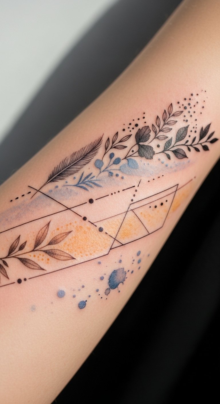 As the colors soften, your tattoos can enhance rather than dominate your appearance, providing a balanced and liberating look that aligns with your personal style. The design symbolizes renewal and balance—soft florals represent growth and delicate resilience while geometric accents hint at structure and personal order; emotionally it conveys gentle confidence and acceptance.