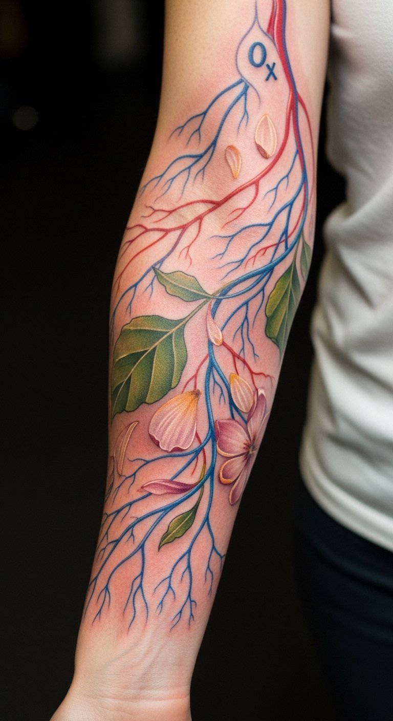 The design symbolizes the intimate connection between the body’s circulatory life and the evolving nature of ink: veins morph into foliage to represent nourishment, renewal, and gradual change.