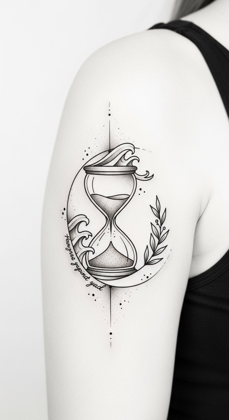 The hourglass symbolizes time and the gradual process of fading, the waves represent gentle transformation and renewal, and the laurel sprig evokes care and protection; together they convey patient, informed stewardship of the body.