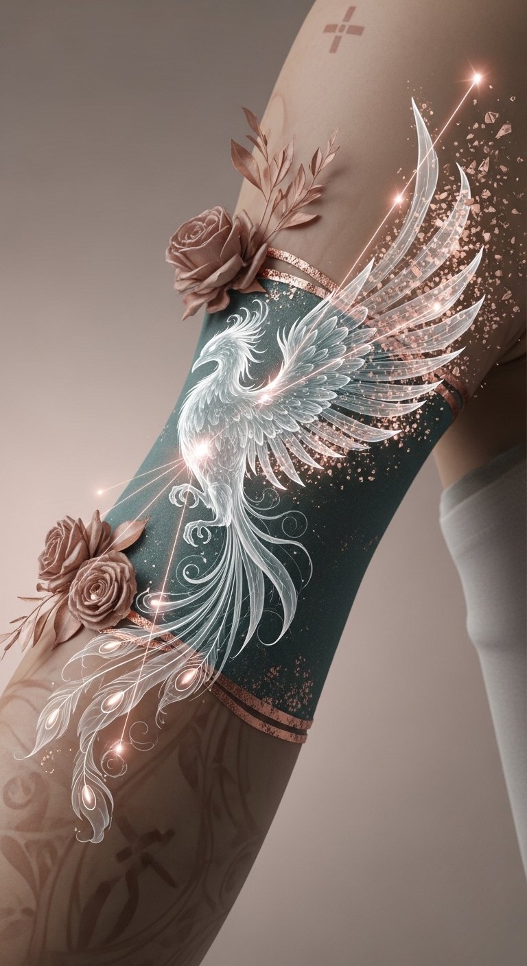 The phoenix symbolizes renewal and transformation, its dissolving ink representing the fading of past choices and the possibility of new beginnings; the circuitry-like beams hint at technological precision and care, evoking confidence and calm.