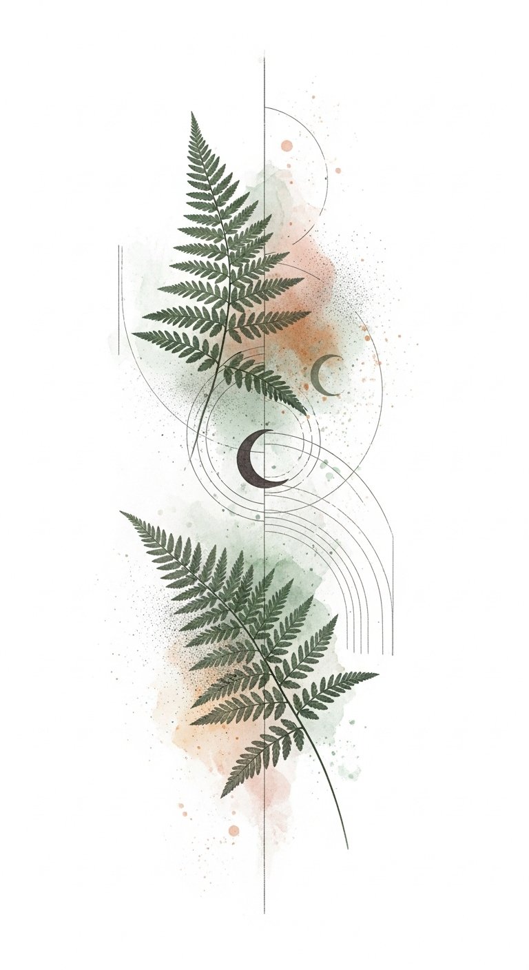 The design symbolizes regeneration and gentle concealment: fern fronds evoke new growth and resilience, watercolor washes suggest healing and softened history, while geometric arcs bring balance and intentionality.