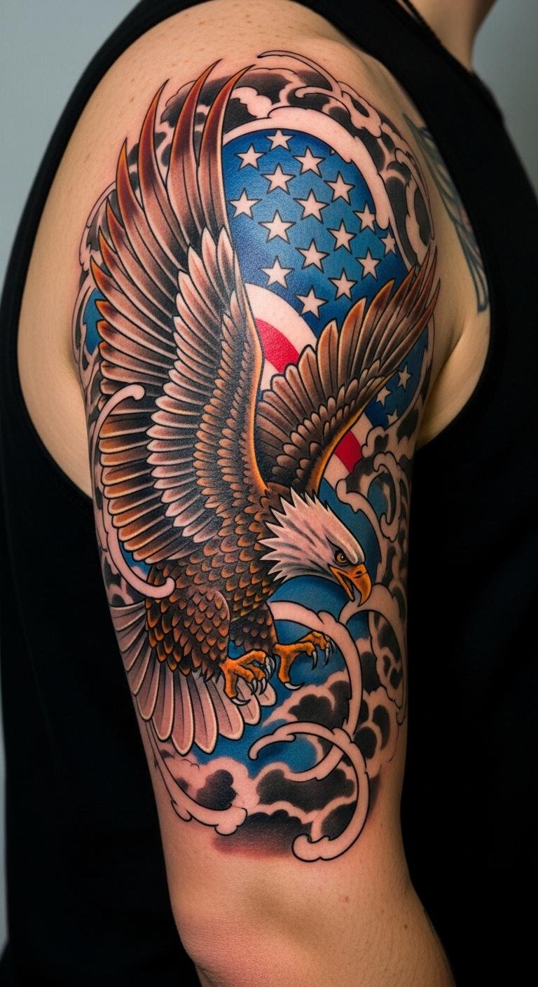 When you think about expressing your unique style, bold American traditional tattoos can serve as a striking canvas. These designs, steeped in history and rich in symbolism, capture the essence of adventure and resilience. From classic anchors to majestic eagles, each piece tells a story that resonates deeply. Are you ready to explore the transformative power of these timeless tattoos and find the perfect design that speaks to your individuality? The composition symbolizes steadfastness (anchor), beauty and growth through hardship (rose), courage and protection (dagger), and freedom and pride (eagle); emotional tones range from defiant strength to tender remembrance. Ideal placement is across the upper chest or centered on the sternum for a commanding, personal statement that reads well with muscular contours and moves naturally with the body.