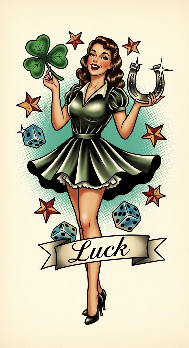 Ideal placement: upper arm, shoulder blade, or calf for visibility and classic pin-up flow; symbolizes optimism, risk-taking, and playful resilience, evoking warm nostalgia and confident swagger.