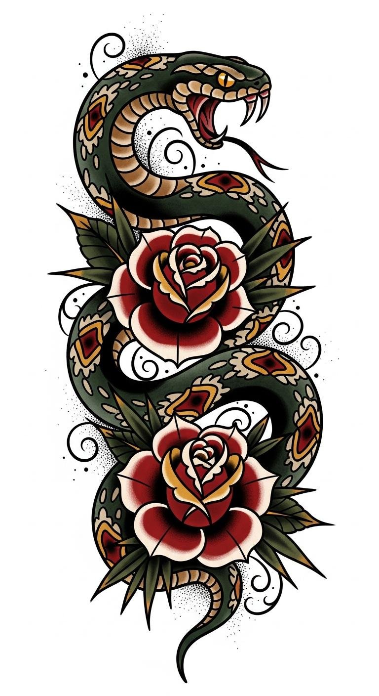 While exploring the world of American traditional tattoos, the dramatic snake and rose design stands out as a striking representation of the duality of life—beauty intertwined with danger.