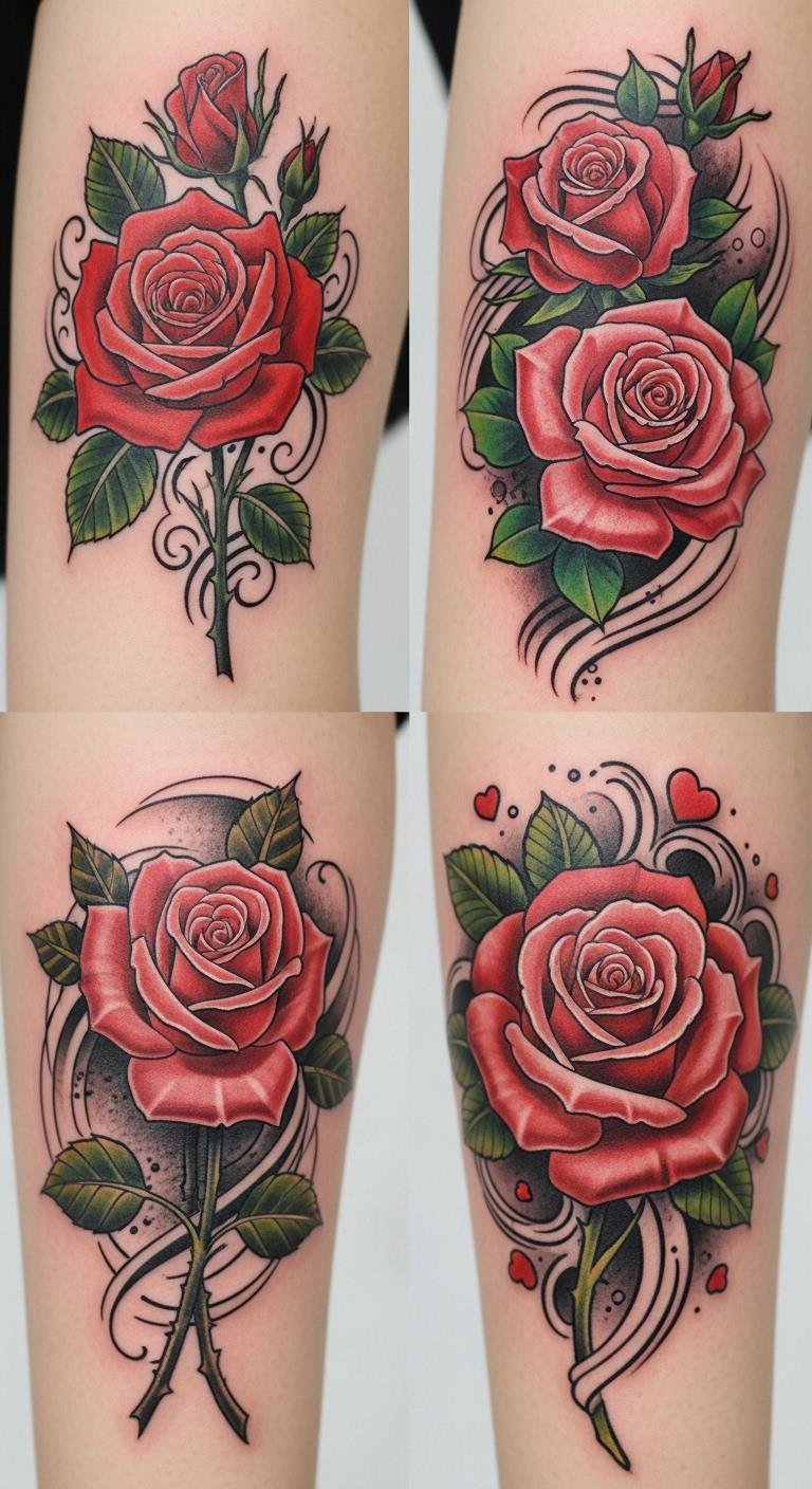 Though roses are often associated with love and beauty, the timeless rose illustration transcends mere aesthetics to embody deep symbolism and artistic mastery. Rich in rose symbolism, these floral tattoos showcase vibrant color meanings and design variations. Whether you choose historical roses or modern interpretations, each tattoo placement reflects personal connections, blending artistic techniques with cultural significance that celebrates your unique style and freedom. This design concept uses a central rose rendered in mixed styles—realistic petals with watercolor washes and fine-line geometric leaves—to evoke timeless elegance and contemporary freedom; color choices (deep crimson for passion, gold accents for achievement, soft lavender for remembrance) and flowing stems guide emotional reading, making it suited for forearm or chest placements where visibility and personal significance intersect.