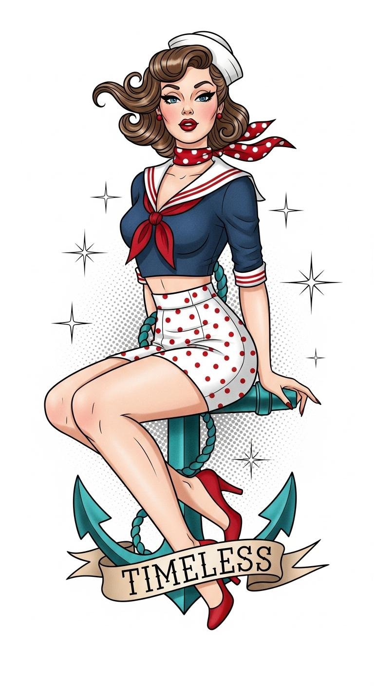 This design symbolizes playful confidence and the enduring spirit of vintage Americana—anchor and sailor motifs ground the figure in classic maritime nostalgia while the banner and stars reinforce resilience and public celebration.