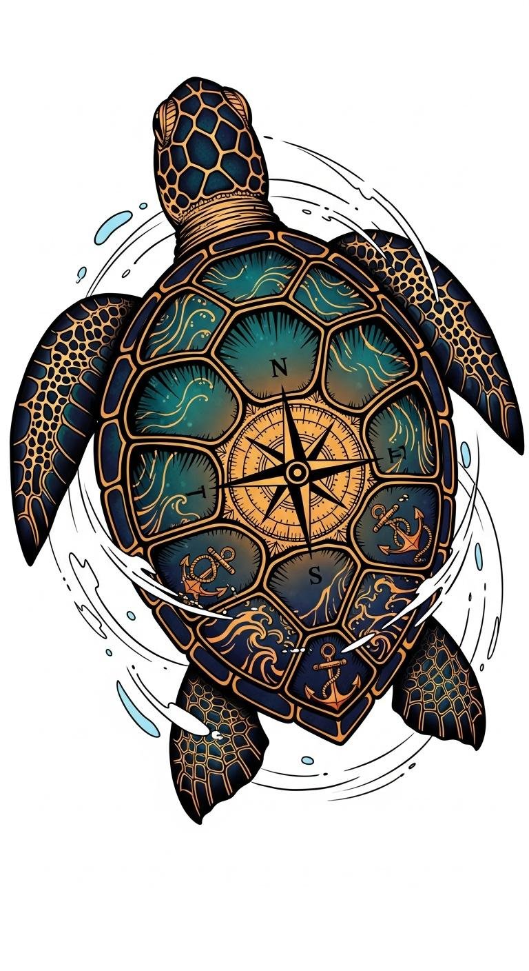 Shellback turtle tattoos symbolize resilience and endurance, embodying the spirit of navigation through life’s turbulent seas.