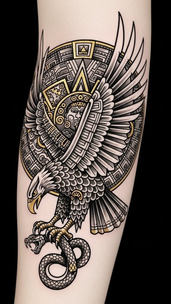 Bold line work stands as a defining characteristic of Aztec-inspired tattoos, capturing the eye with its striking clarity and strength.