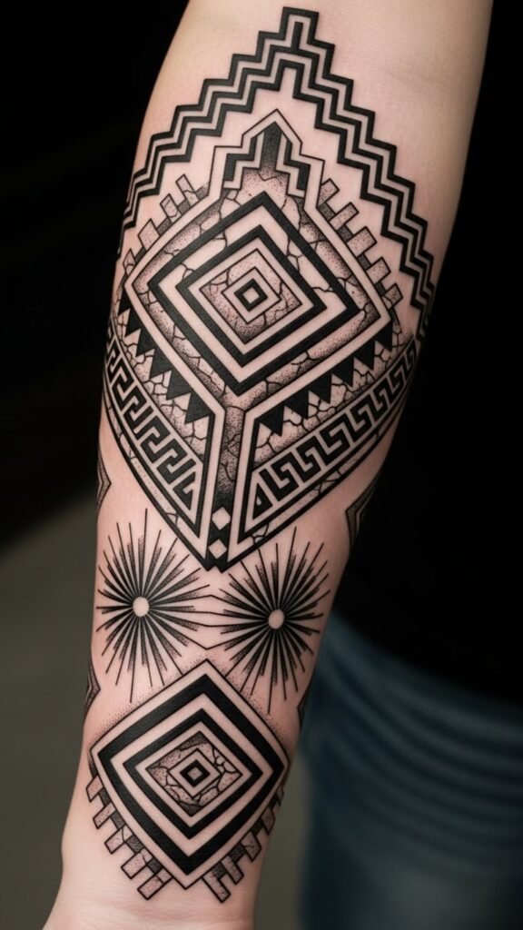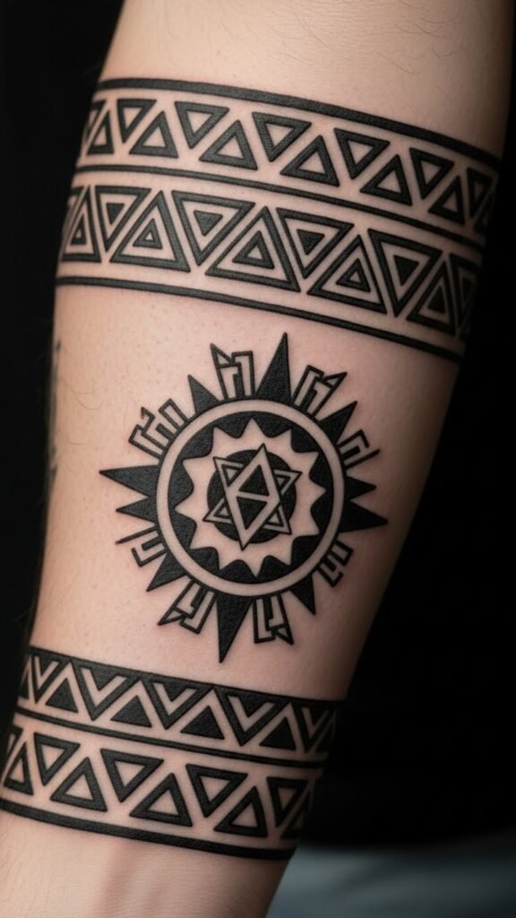 The design uses bold, graphic lines to evoke resilience and ancestral continuity—thick contours for protection, step patterns for life’s journey, and the sun disk as vitality—conveying pride and personal narrative; ideal placement is the outer forearm for visibility and flow, allowing the wearer to display strength while the negative space and high contrast maintain clarity over time.