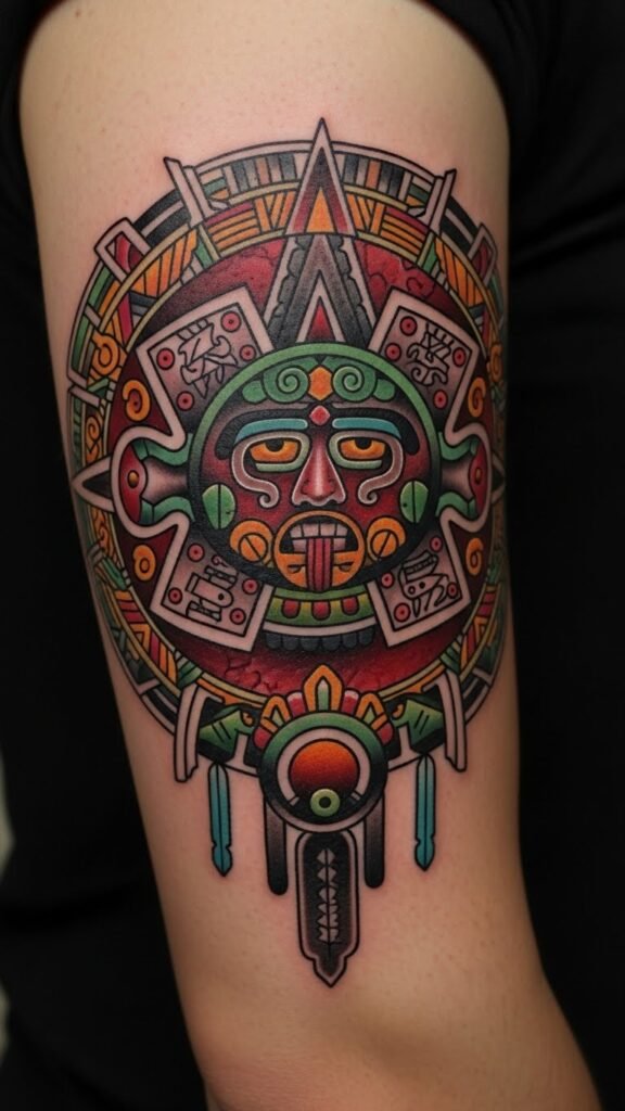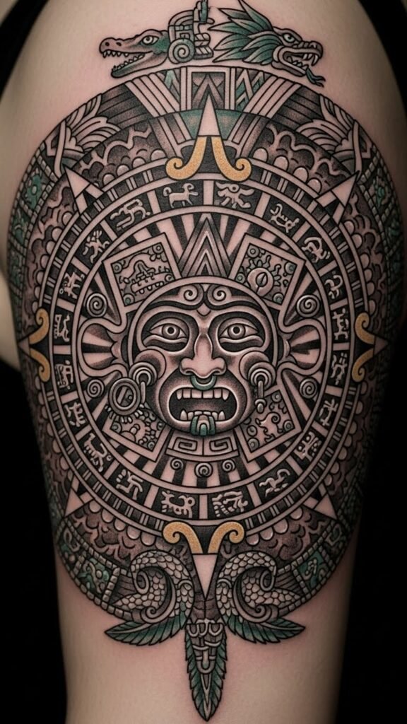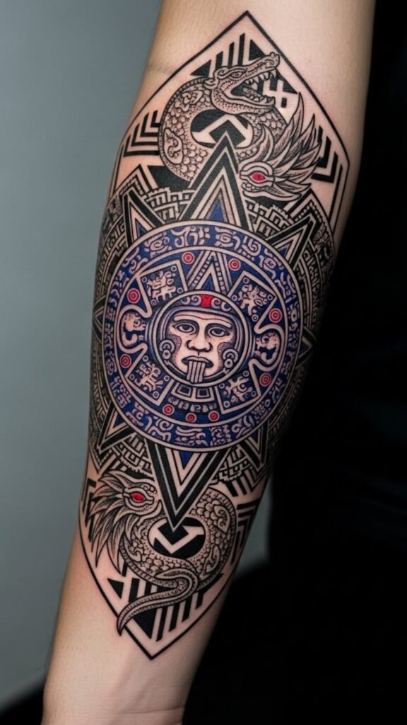 The Aztec calendar tattoo, a striking emblem of time and cosmology, captures the essence of a civilization deeply attuned to the cycles of nature and spirituality.