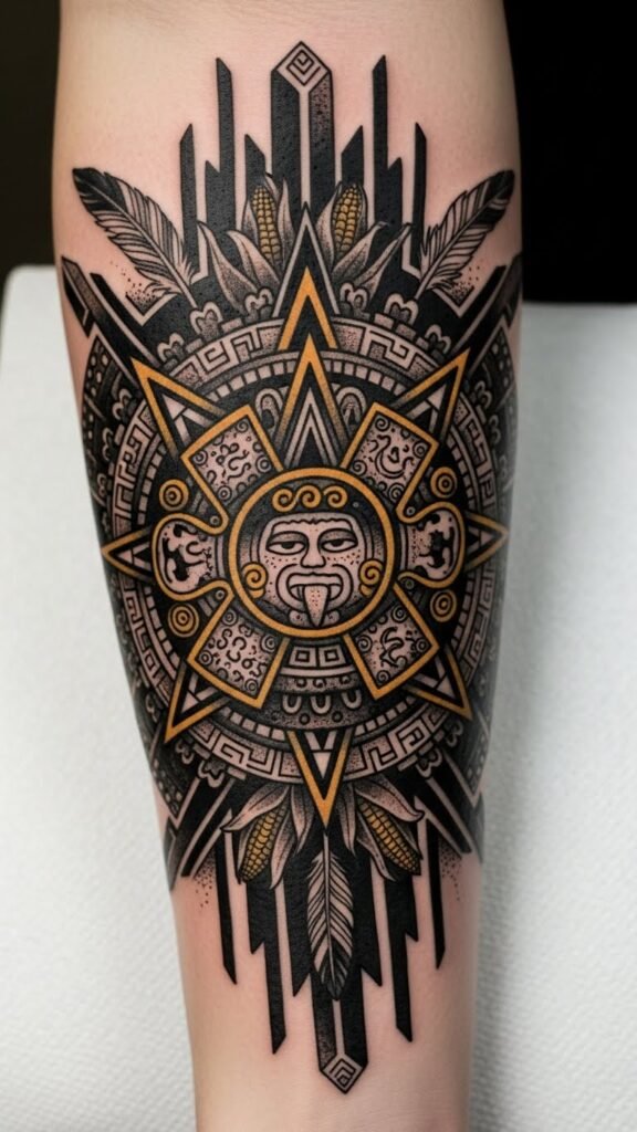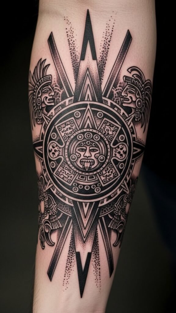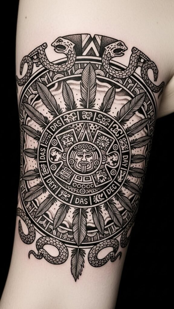 This artistic fusion allows heritage expressions to flourish, inviting you to celebrate your identity while embracing the rich narratives these timeless designs offer. The design evokes resilience and continuity through the sunstone’s central axis, while feathered serpents suggest transformation and link to ancestry; fine dotwork and negative space create a contemplative, ritual feel that reads clearly on the outer forearm and flows naturally with musculature.