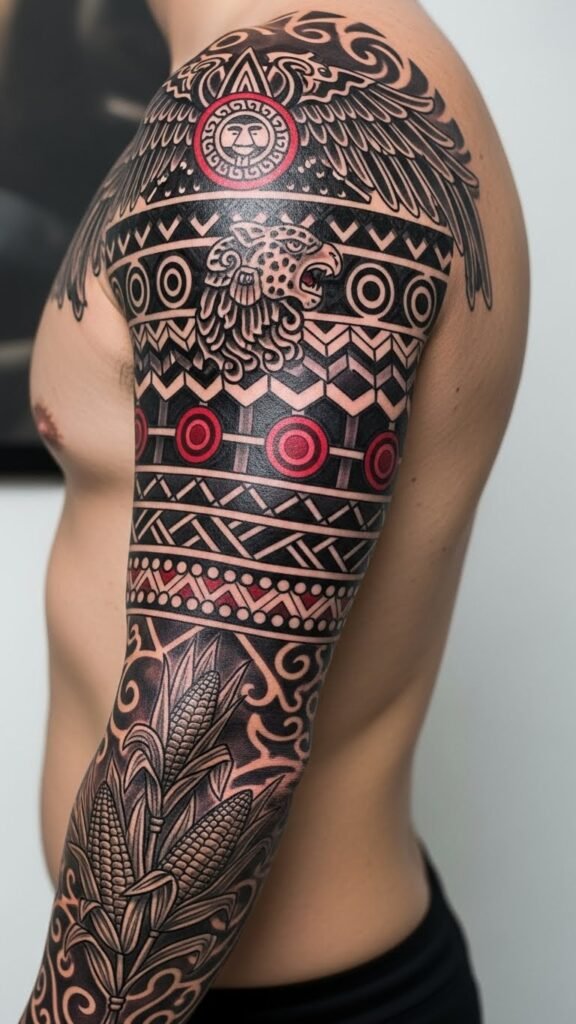 Each tattoo told a story, celebrating individuality while acknowledging the connections that bind you to your community. The design places the most intricate elements—sun discs and layered animal motifs—on the upper arm and shoulder to signify higher rank, while simpler maize and band patterns wrap the forearm to represent community ties.