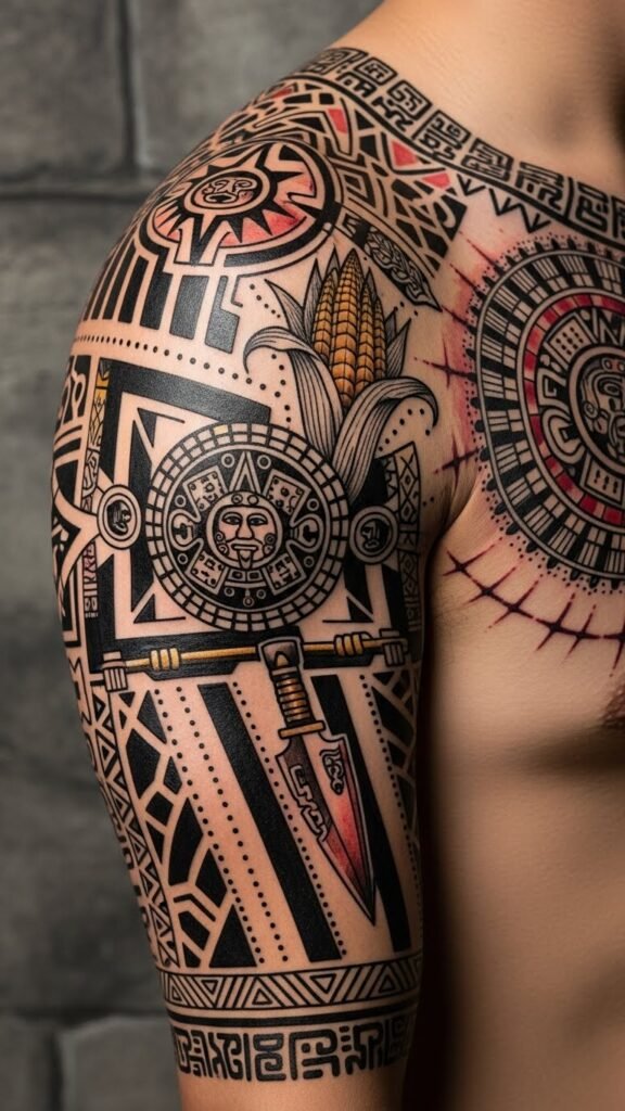 The design channels that ritual gravity: maize and sun symbols evoke fertility and life-cycles, the sacrificial knife and concentric god-emblems reference devotion and duty, geometric borders suggest communal identity, and red/gold accents hint at blood and divinity; emotionally it balances reverence with empowerment, suited for upper chest and shoulder placement where it reads outward during ceremonial dress.