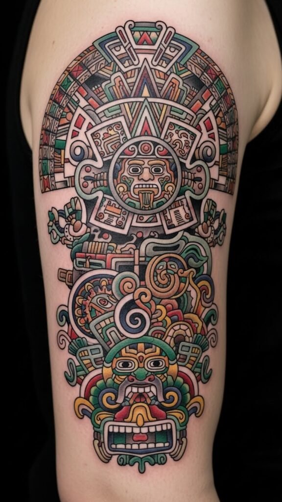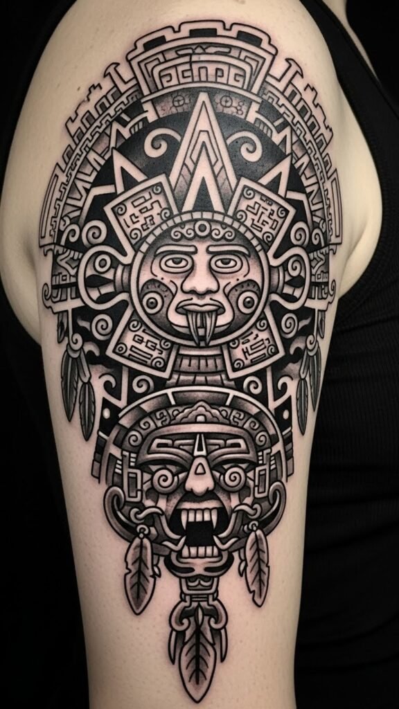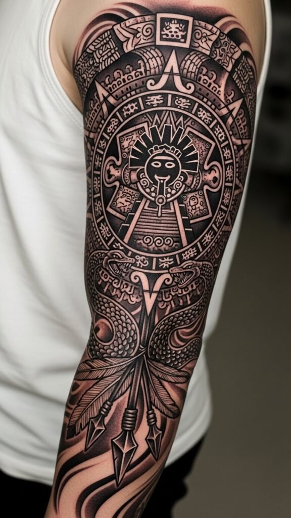 Each design tells a story, allowing you to express your individuality while connecting with the rich cultural heritage of the Aztec civilization. This design evokes resilience and ancestral power through the sun god’s ascent and protective serpents; emotionally it reads as both defiant and reverent, ideal for placement as a 3/4 sleeve wrapping the upper arm and shoulder so the pyramid and sunstone sit on the deltoid while serpents and spears flow down the biceps, allowing movement to animate the narrative.