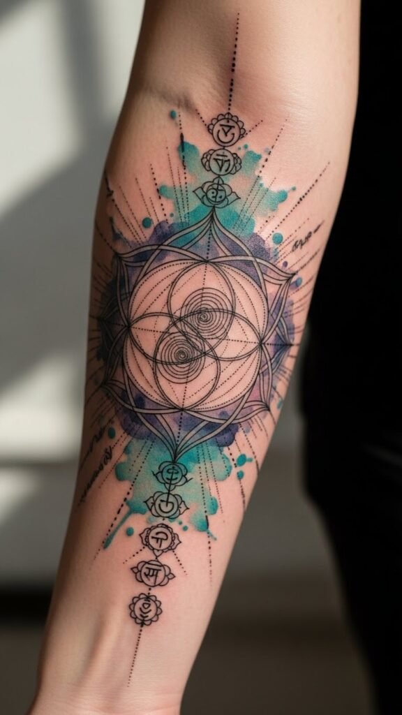 This forearm placement aligns with visibility and personal ritual: the mandala center anchors inner balance, the golden-ratio spirals suggest growth and harmony, chakra sigils mark energetic points along the arm, and the watercolor tones evoke introspection and calm; together they offer a wearable map of spiritual journey, intimate yet shared.