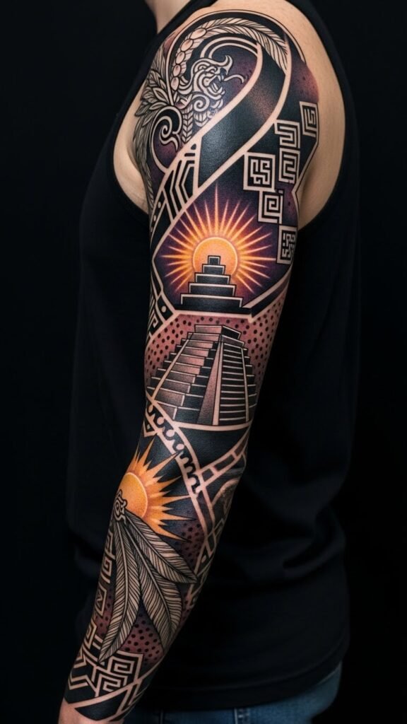 The suggested placement—forearm wrap for visibility and movement, upper arm sleeve for bold statement, or spine for a central transformative axis—amplifies the emotional resonance: pride, renewal, and an ongoing commitment to personal growth; the glyphs and sun disk anchor cultural reverence while geometric patterns and color choices convey intellect and creative energy.