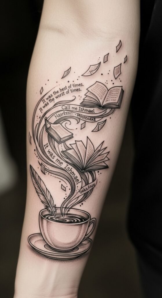 These tattoos celebrate the fusion of caffeine and creativity, capturing your passion for both literature and the perfect cup.