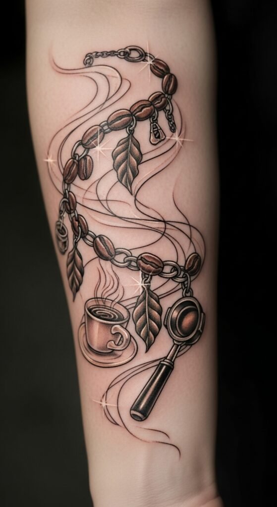 A bracelet-style coffee tattoo wraps around your wrist like a beloved accessory, seamlessly blending artistry with your daily caffeine ritual.