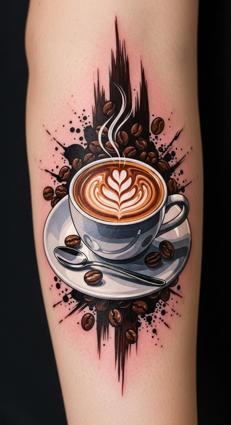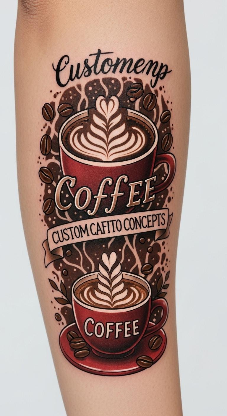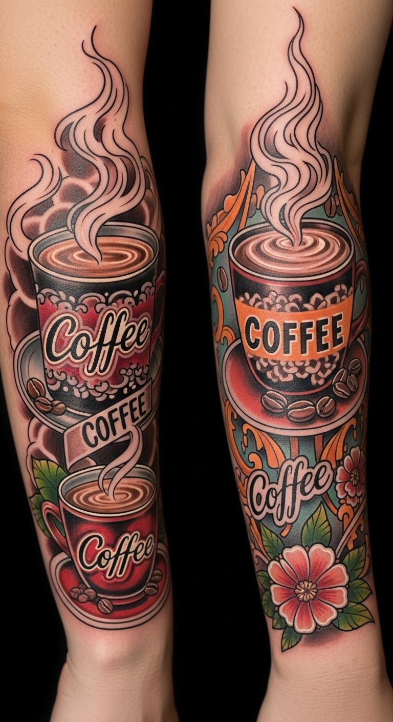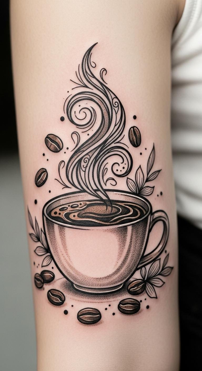 Emotionally it feels nostalgic and confident; ideal placement on the forearm, inner bicep, or across the sternum lets it be shared openly or kept close, depending on how prominently you want to express your love for coffee and personal narrative.