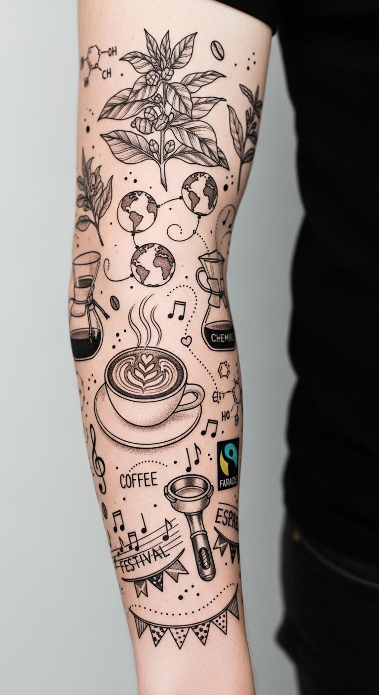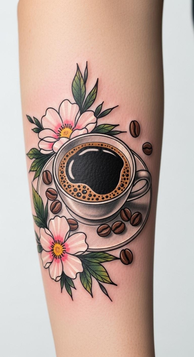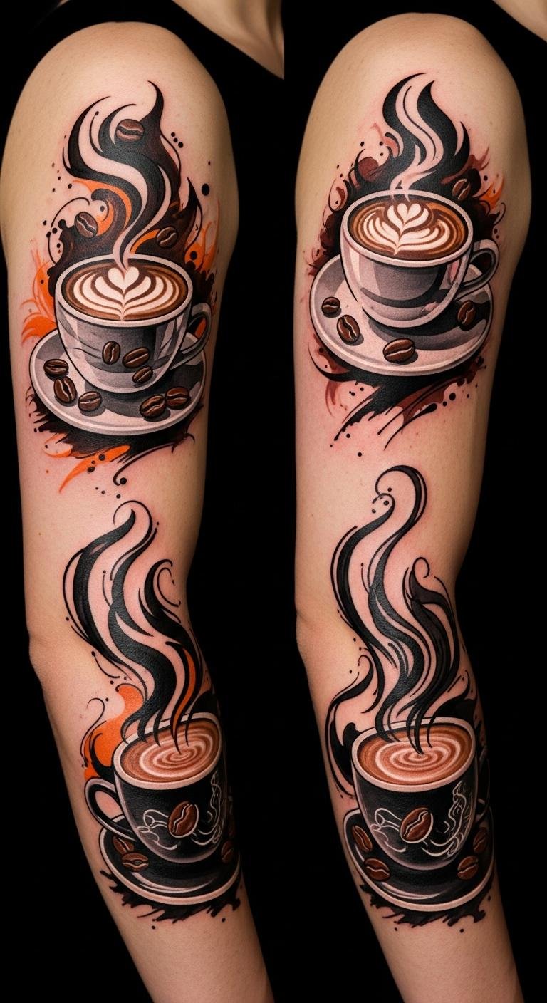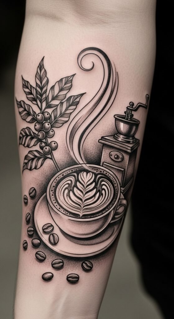 Emotionally it feels nostalgic and confident; ideal placement on the forearm, inner bicep, or across the sternum lets it be shared openly or kept close, depending on how prominently you want to express your love for coffee and personal narrative.