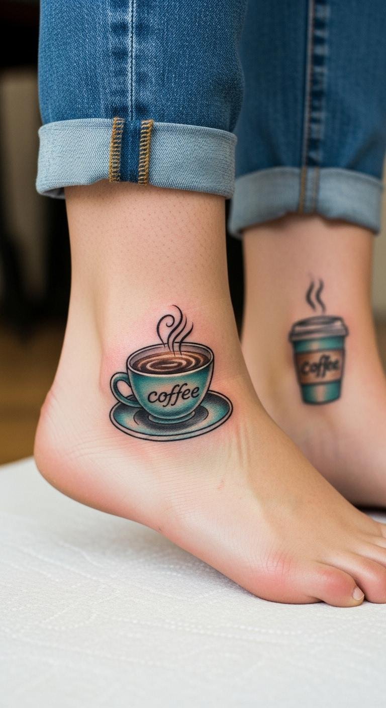 An ankle coffee cup tattoo symbolizes warmth, daily ritual, and cozy connection—its placement near the ankle keeps the image intimate yet easily revealed, like a private comfort shared with close friends.