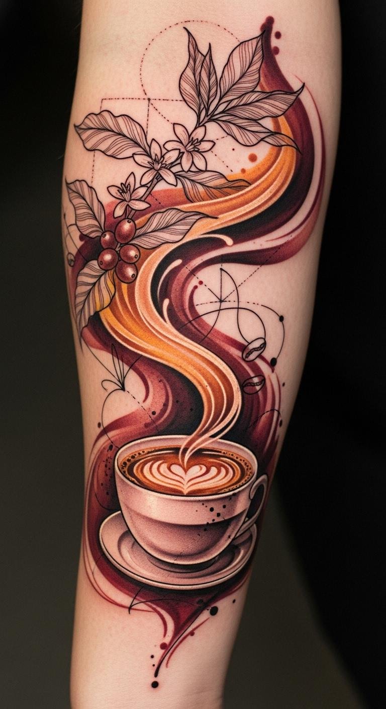 Placing this design on the forearm or shoulder allows the flowing colors to follow natural contours, evoking warmth and daily ritual; the combination of botanical details and geometric accents expresses connection to nature and personal routine, while the rich palette conveys comfort, energy, and quiet celebration of small pleasures.