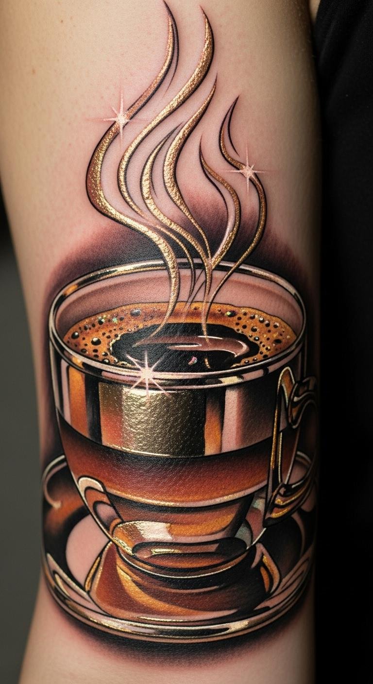 This artistic layering introduces design depth and color contrast, transforming your tattoo into a radiant masterpiece that truly stands out. The metallic elements symbolize warmth, luxury, and the small daily rituals that ground us; emotionally the piece evokes comfort, attentiveness, and a celebration of simple pleasures.