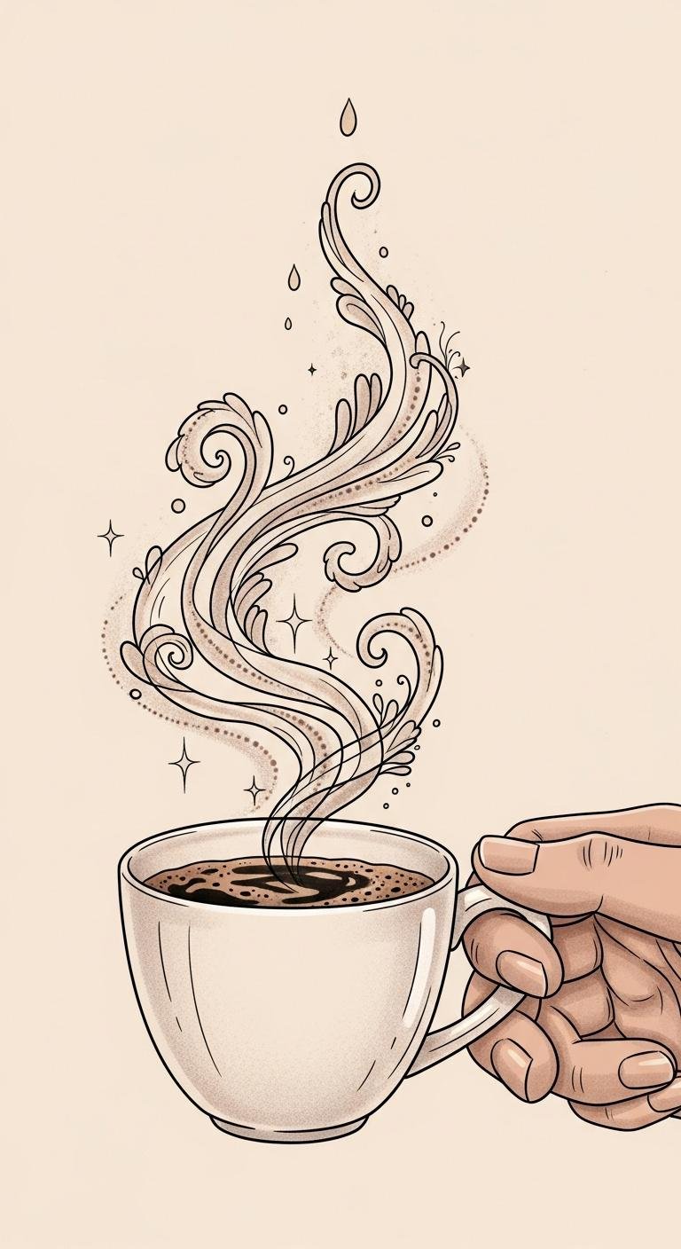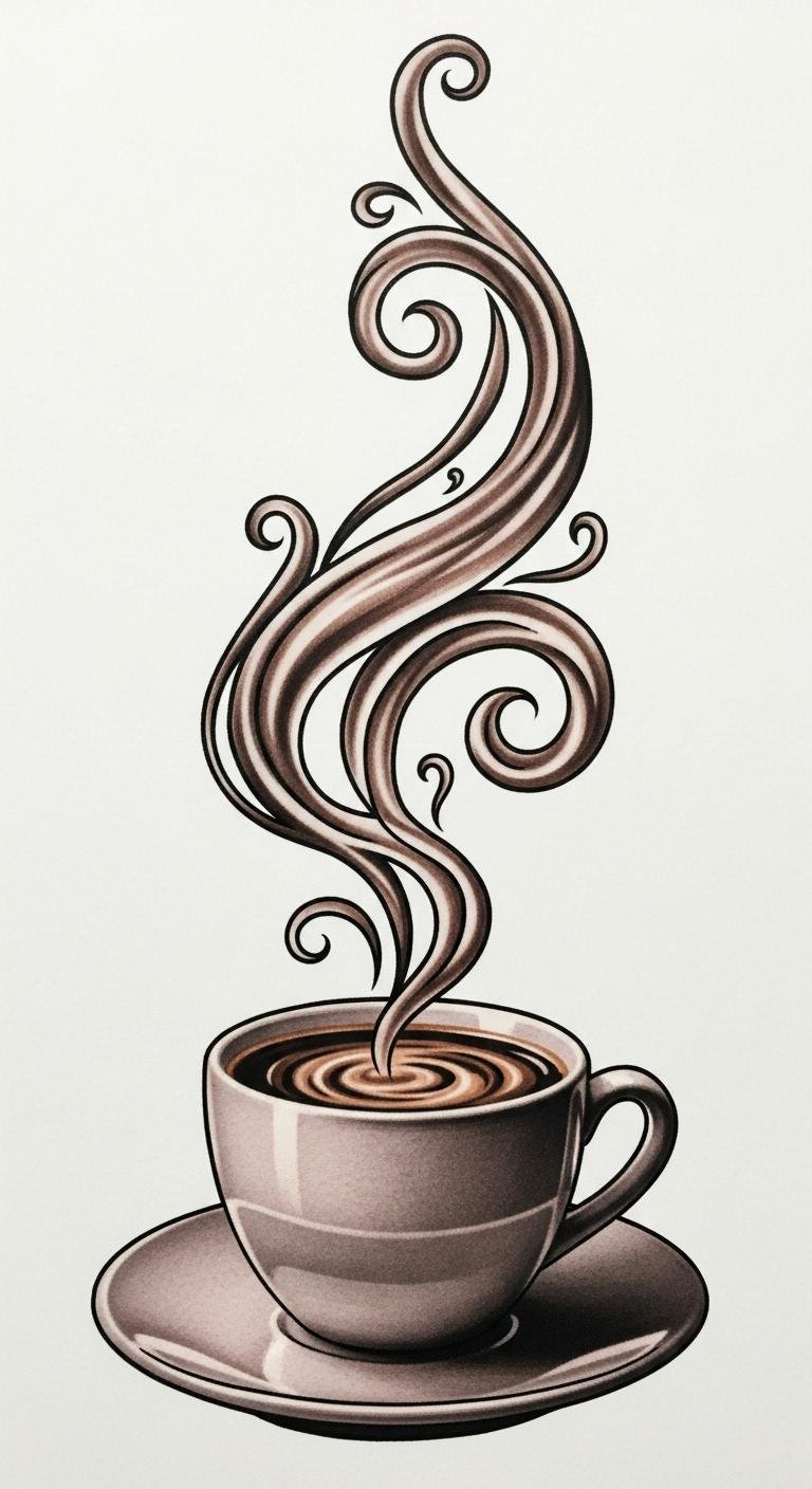 This design symbolizes daily ritual transformed into magic—comfort, inspiration, and the creativity sparked by a simple cup; its flowing lines evoke calm and movement, making it ideal for a forearm, rib, or behind-the-ear placement where the vertical vapor can follow the body’s natural contours and be shown or concealed as desired.