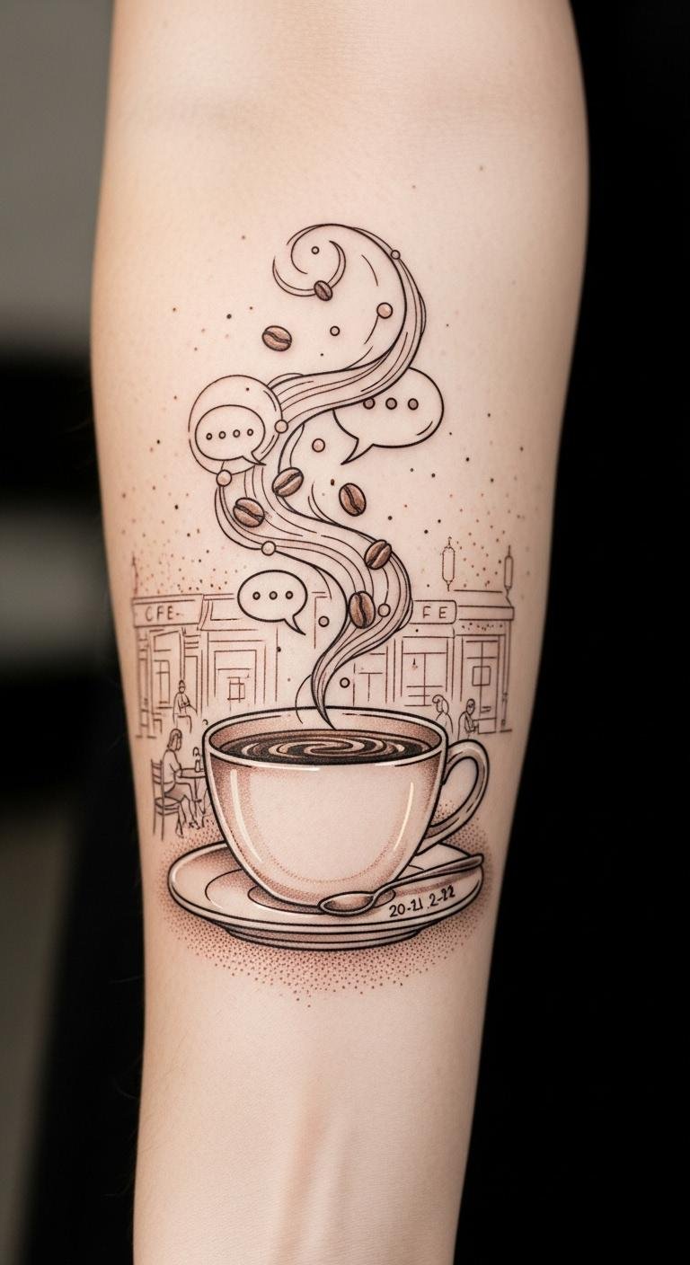 This design visually weaves the idea that a tattoo can spark conversation like a cup of coffee, using steam-turning-into-speech-bubbles to symbolize dialogue and connection; the coffee beans and café dotwork ground it in coffee culture while the handwritten detail personalizes the story.
