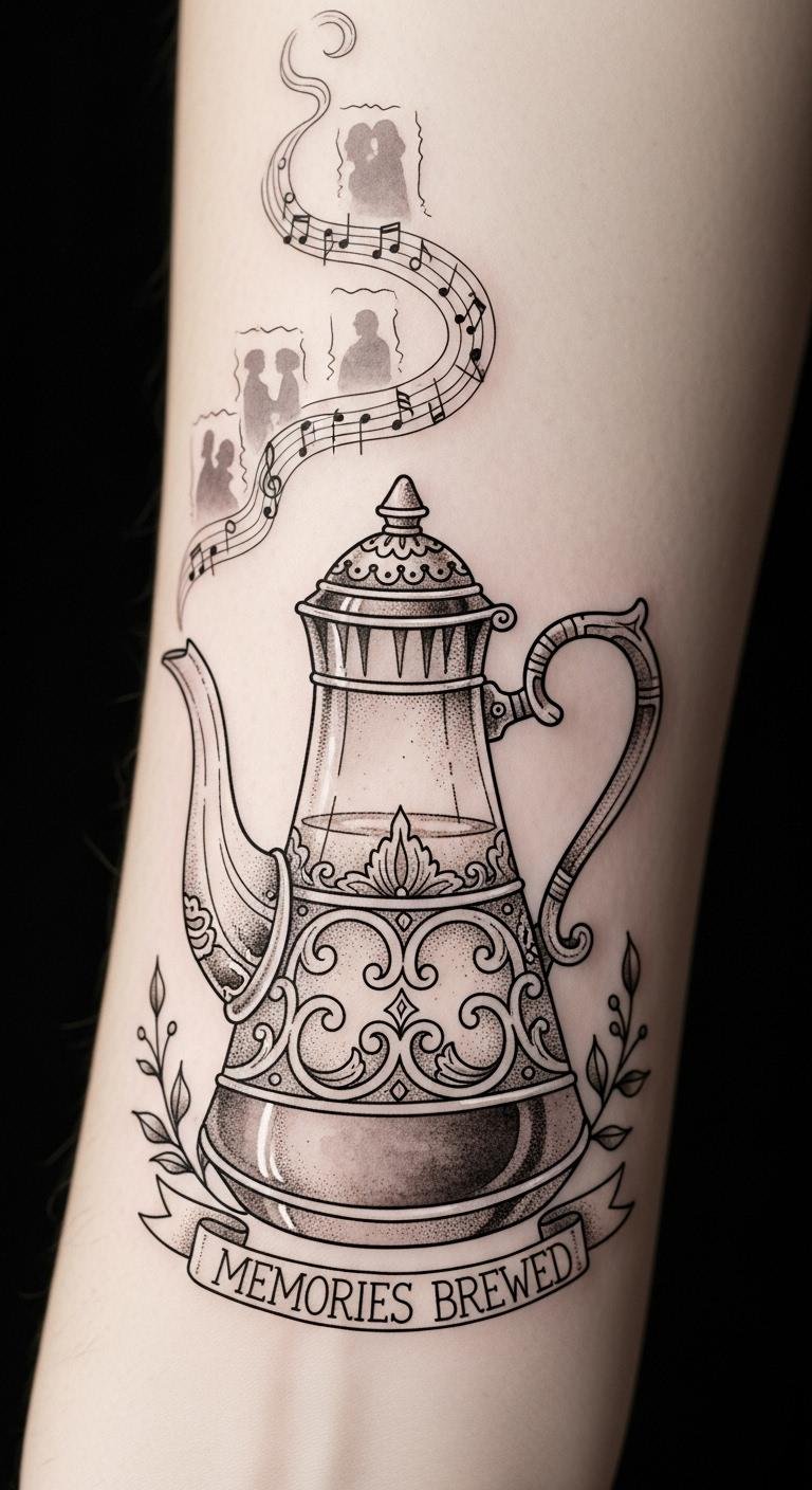 A delicate forearm or ribcage tattoo combining a steaming pour-over carafe whose steam morphs into an outline of significant locations or dates, with small symbols like a coffee bean, a vintage cup, and a handwritten word meaningful to you; rendered in fine-line black ink with subtle sepia shading to evoke warmth and nostalgia. Symbolically the carafe represents craft and daily ritual, the steam-as-memories shows how moments rise and shape identity, and the tiny icons capture personal tastes and milestones—together conveying comfort, dedication, and intimate love for coffee culture; placement along the forearm or ribcage lets the design flow with your movements, keeping it both private and shareable depending on posture and clothing.