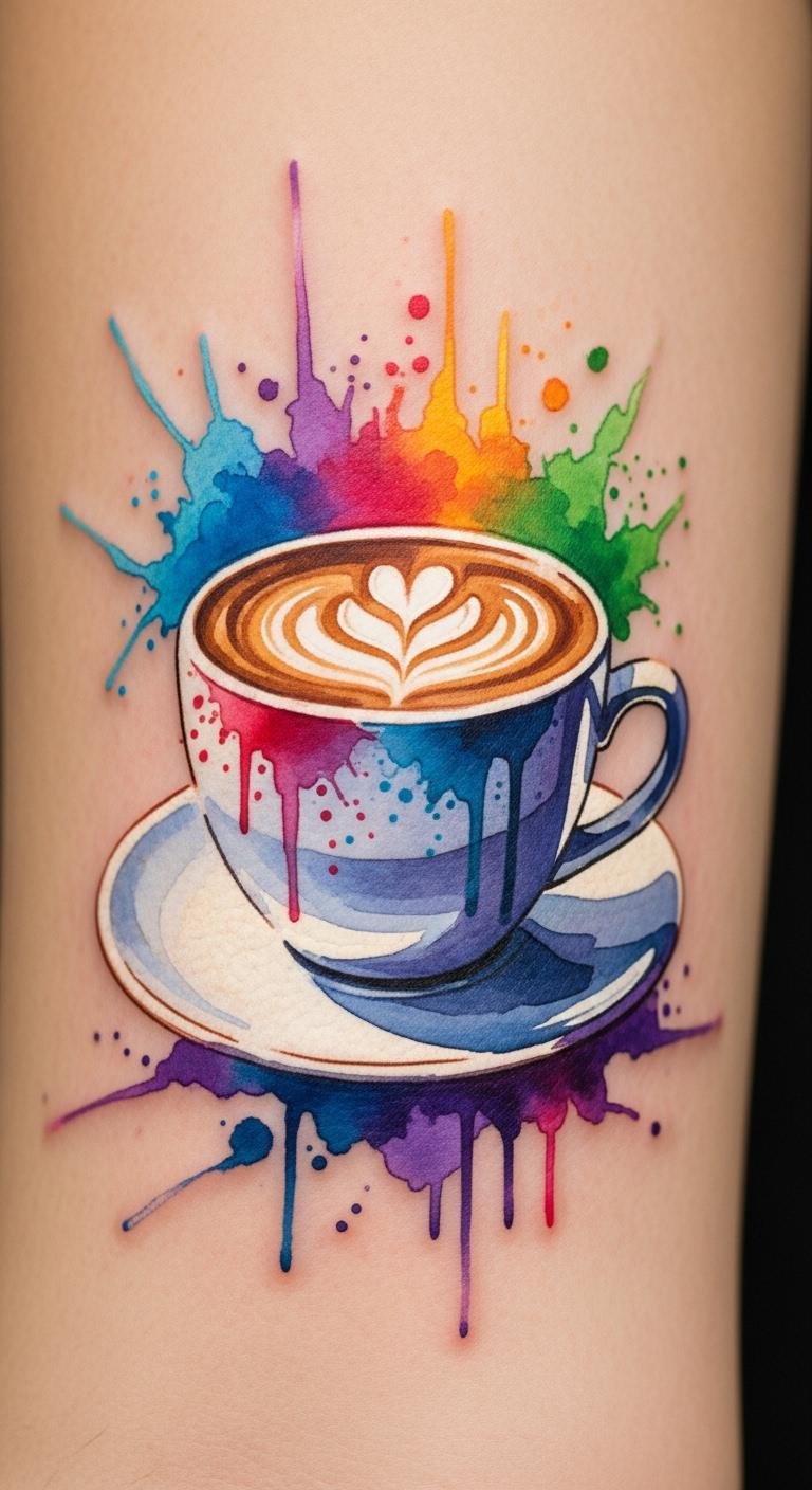 This tattoo concept pairs a loose watercolor-style coffee cup with dynamic washes of color radiating outward, symbolizing creativity, warmth, and daily ritual; the flowing brushstrokes represent spontaneity and personal expression while the cup anchors the design in familiarity and comfort.