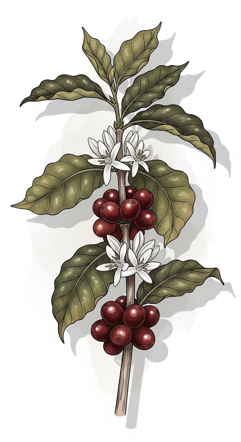 A tattoo concept that blends the full lifecycle of the coffee plant—bud, blossom, and ripe cherry—symbolizes growth, renewal, and the daily ritual of awakening; its soft earth-tones and green hues evoke tranquility and rootedness, while the vertical forearm or ribcage placement offers a private yet visible canvas that moves with the body, conveying personal freedom and a quiet celebration of nature each time it’s seen.