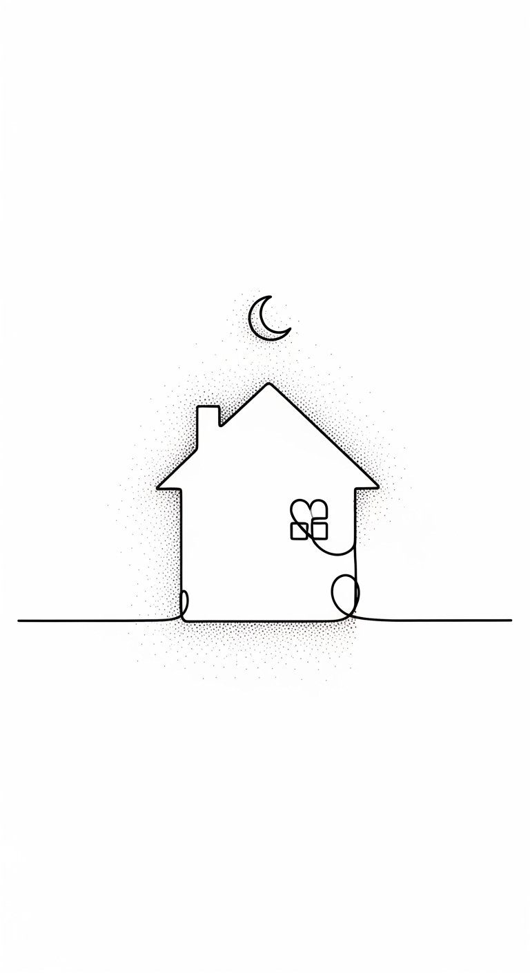 This design concept draws on the original text’s themes of celebrating homes and cherished memories, using the house as a focal symbol of roots and belonging while flowers and ivy signify growth and nostalgia; the open door evokes welcome and freedom, the stars hint at personal stories and quiet nights, and the ribbon allows a date or word that ties the piece to a specific memory.