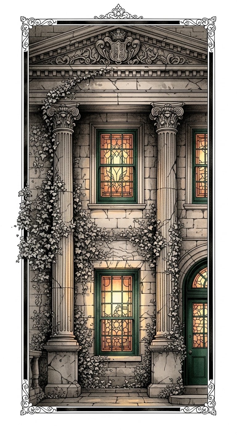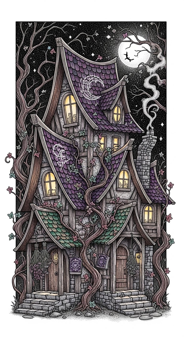 This design channels the original text’s interplay of mystery and home by combining arcane motifs with domestic architecture; the crescent moon and all-seeing eye suggest watchful protection and hidden knowledge, alchemical sigils imply transformation and inner work, and thorny vines forming a pentacle evoke protection and boundary-setting.