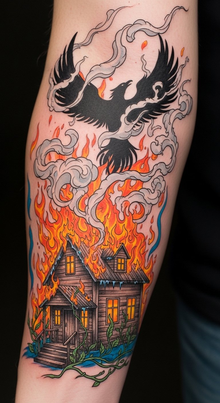 A burning house tattoo captures this fire symbolism, reminding you that from ashes rise new beginnings.