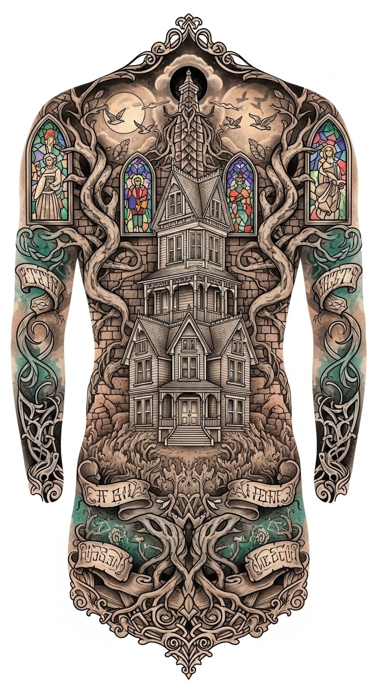 Let your back become a canvas for your life’s tale! This design uses the house as a vessel of memory—roots and branches represent origins and growth, stained-glass icons hold intimate symbols, the moon and birds suggest transition and hope, and banners with handwritten script carry personal phrases; placed centered on the spine to read like a biography, shaded and colored to evoke nostalgia and resilience.