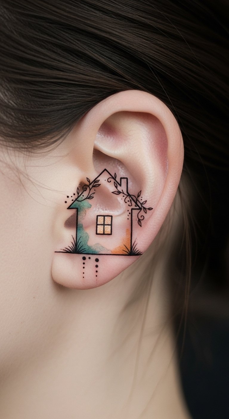 The house design symbolizes refuge and inner stability, the glowing window suggests hope and warmth, the vines represent growth and time; placed snugly behind the ear it remains private yet comforting, evoking quiet emotion and personal narrative whenever glimpsed or touched.