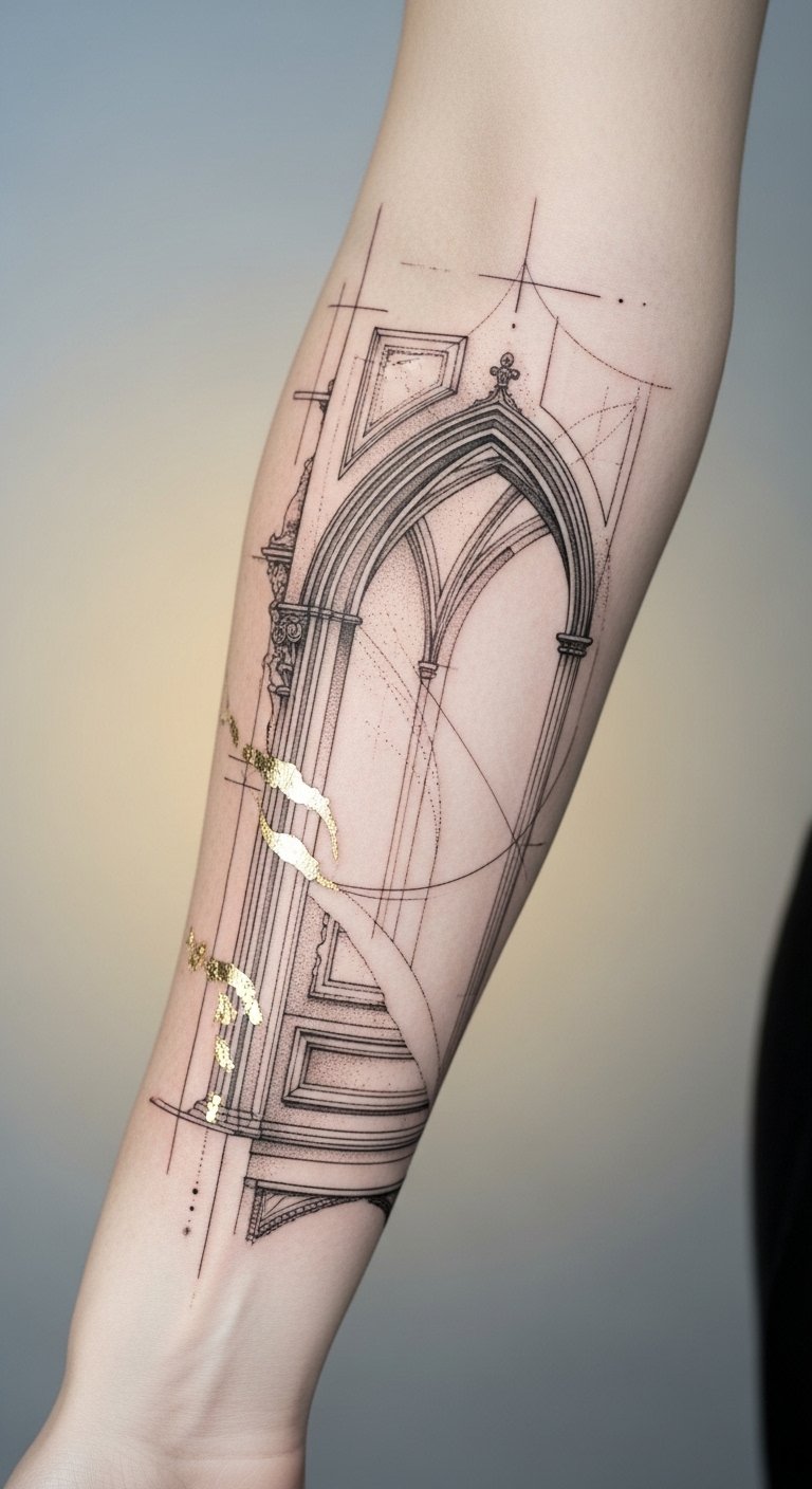 This design uses the Gothic arch as emotional uplift, the molding patterns as memory bands, and drafting lines as life’s plans—placed along the inner forearm so the piece can be both intimate and visible, evoking strength, refinement, and personal narrative.