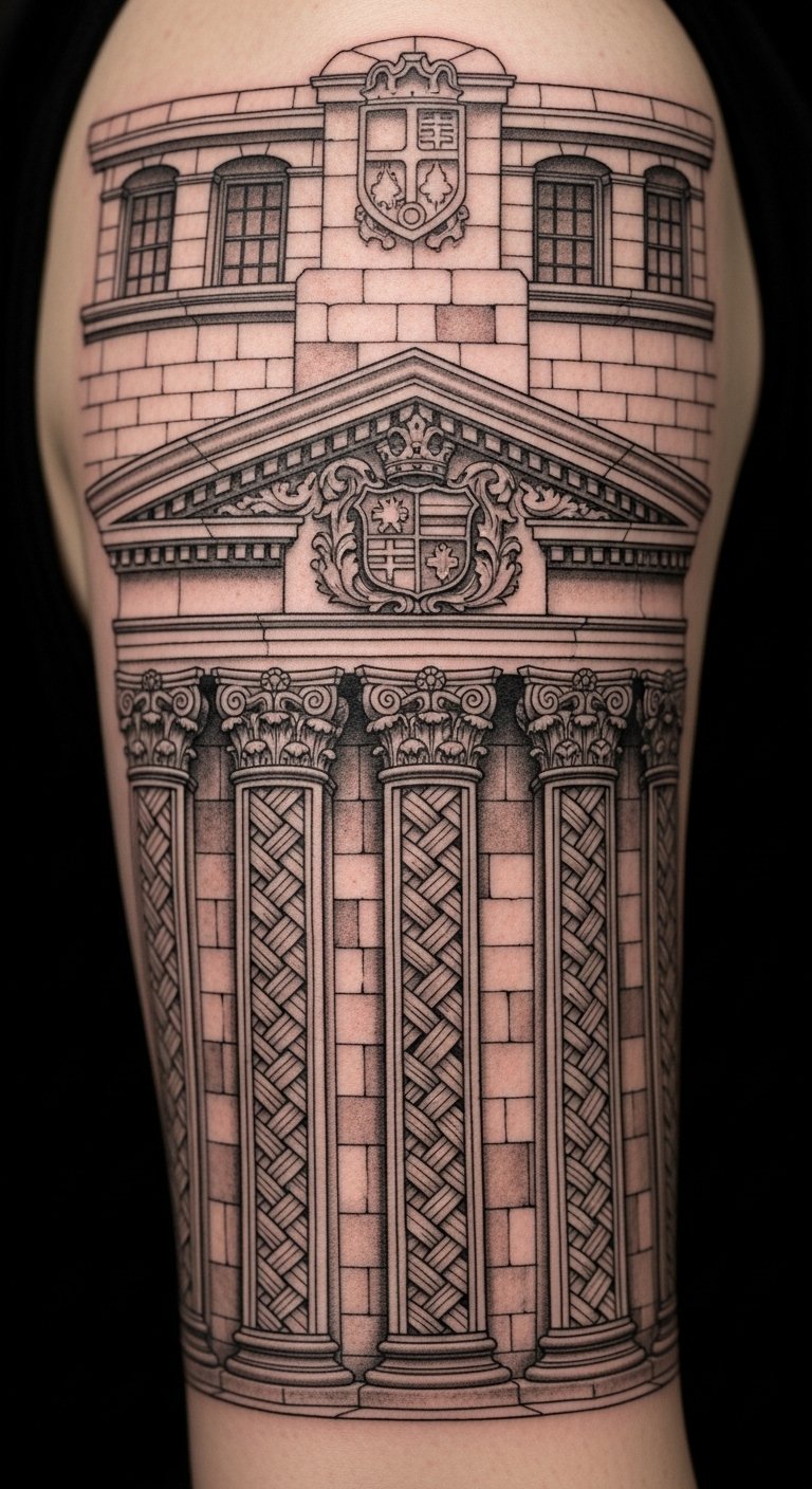 Ideal placement along the forearm or upper back allows the architectural details to flow with the body’s lines, making it visible for personal reflection or easily covered when preferred.