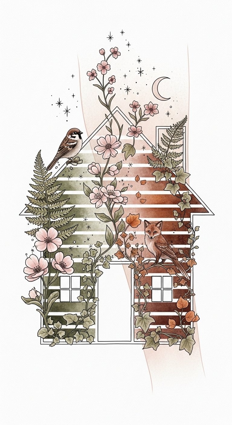 Incorporating nature elements into house tattoos not only enhances their visual appeal but also deepens the connection to your personal story, evoking symbolism of growth, shelter, and journey through seasonal change; the sparrow and fox suggest freedom and cunning, while the shifting flora and wood textures convey resilience and rootedness.