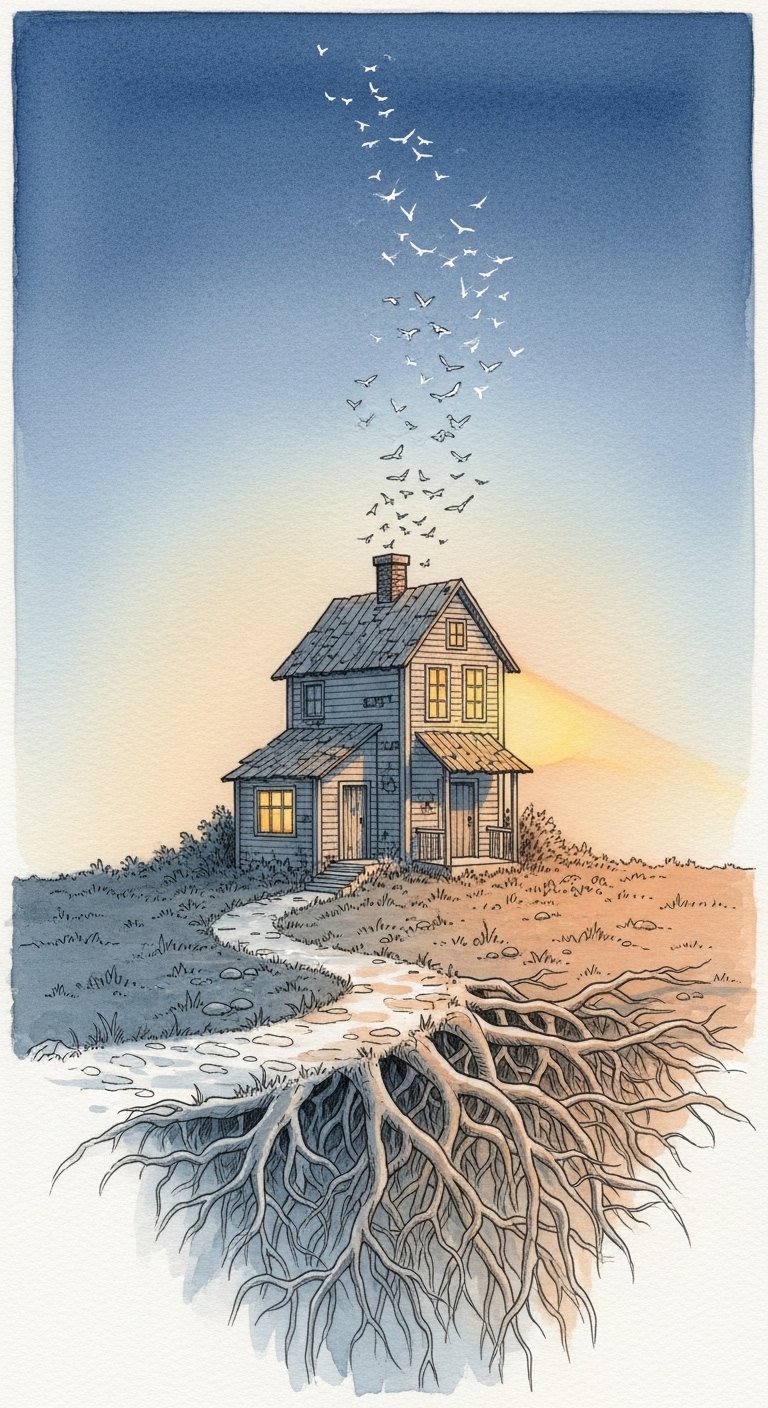 This design carries a gentle, contemplative emotion—comforted by home yet open to exploration—and fits well on a forearm for daily visibility or the upper back for a larger, intimate canvas.