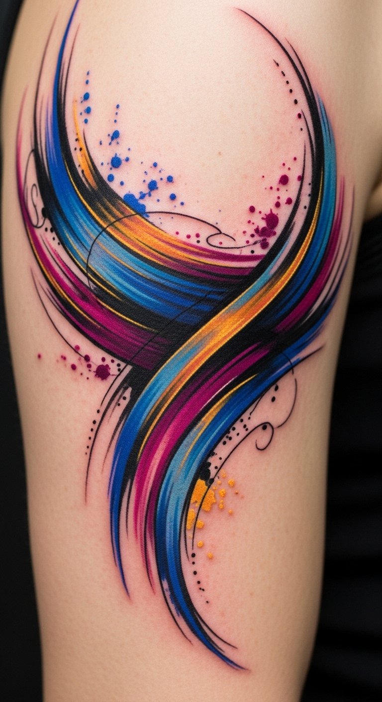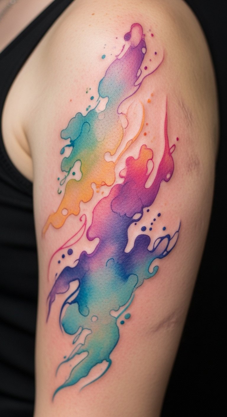 A flowing, multi-hued tattoo concept designed to integrate and celebrate keloid scars: sweeping watercolor washes in teal, magenta, and gold that cascade and blend over raised textures, accented with fine-line botanical elements that weave around scar contours; soft gradients, layered translucent pigments, and subtle white highlights create depth and seamless transitions; ideal placements include the shoulder blade, chest, or along the ribcage where natural movement enhances the illusion of motion and unity. This design symbolizes transformation and self-acceptance, channeling resilience into a joyful palette; emotionally it conveys empowerment, healing, and the celebration of personal history while using placement to honor private or visible aspects of one’s journey.
