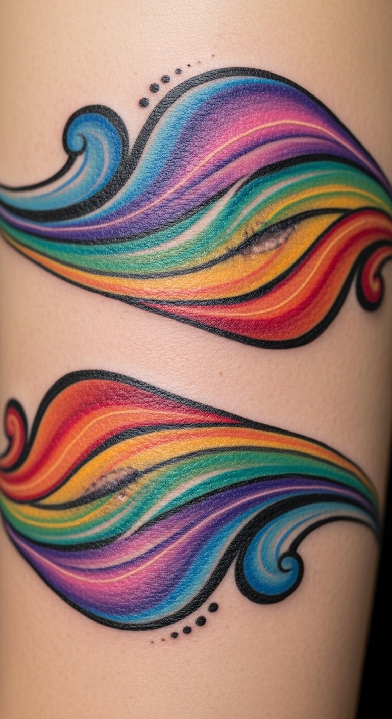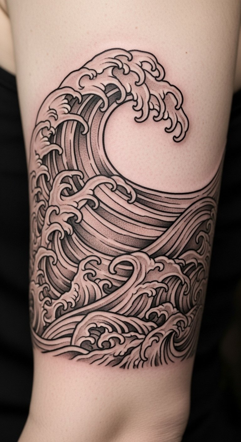 These waves symbolize healing and continuous motion—fluid lines that both conceal and highlight scars, turning past pain into a story of strength. Emotionally, the design evokes calm, renewal, and adventurous spirit; the rhythmic flow suggests movement forward and acceptance. Ideal placements include along the ribcage, forearm, shoulder blade, or wrapping gently around the wrist or ankle where the curves can follow the body’s contours and scars can be integrated seamlessly into the wave pattern.
