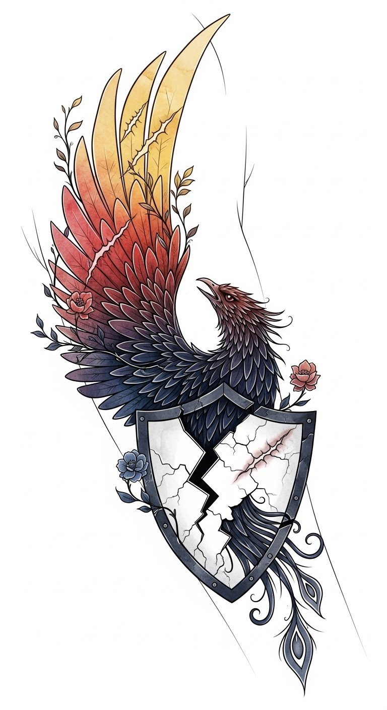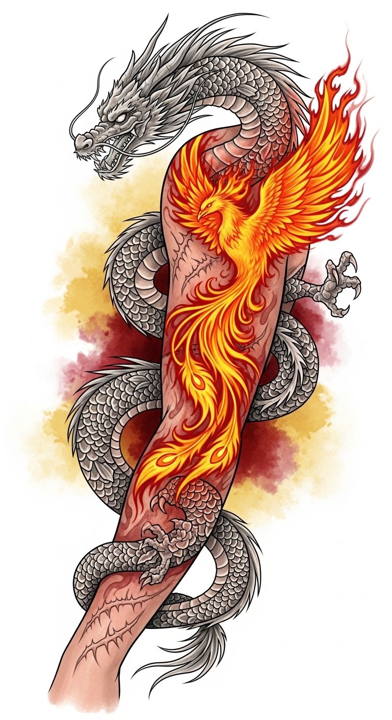 Ideal placements are a forearm wrap for the dragon to follow natural contours and a shoulder-to-chest placement for the phoenix to convey upward movement; color choices (muted golds, deep reds) evoke warmth and courage, and fine linework with realistic shading ensures the tattoo reads both up close and from a distance, conveying emotional resilience and the beauty of transformation.