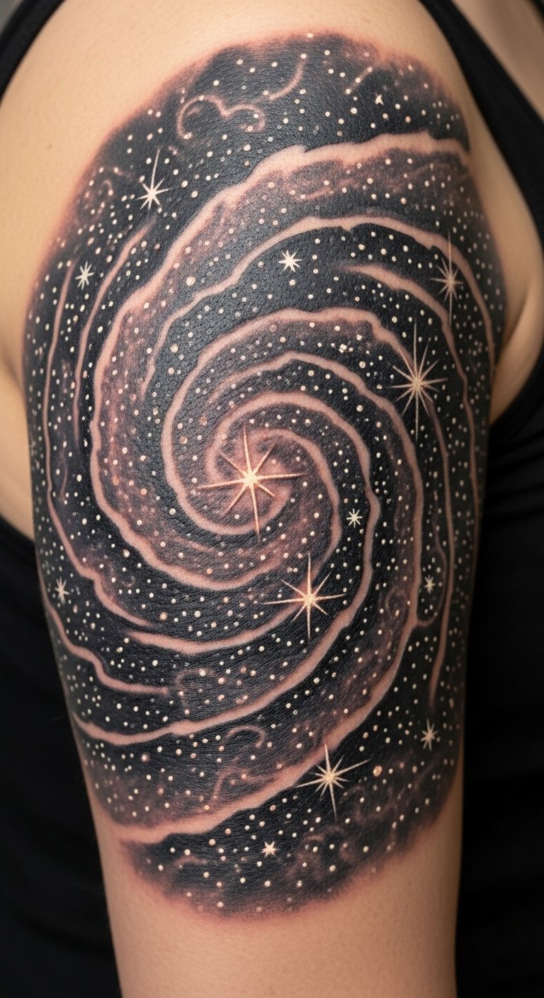 A design centered around a flowing band of stars and soft nebula-like shading that curves to follow the natural contours of the body, with brighter focal stars and tiny constellation dots accenting the keloid area; symbolism emphasizes transformation and resilience—the scar becomes the heart of a cosmic map illustrating personal growth, freedom, and connection to something vast.